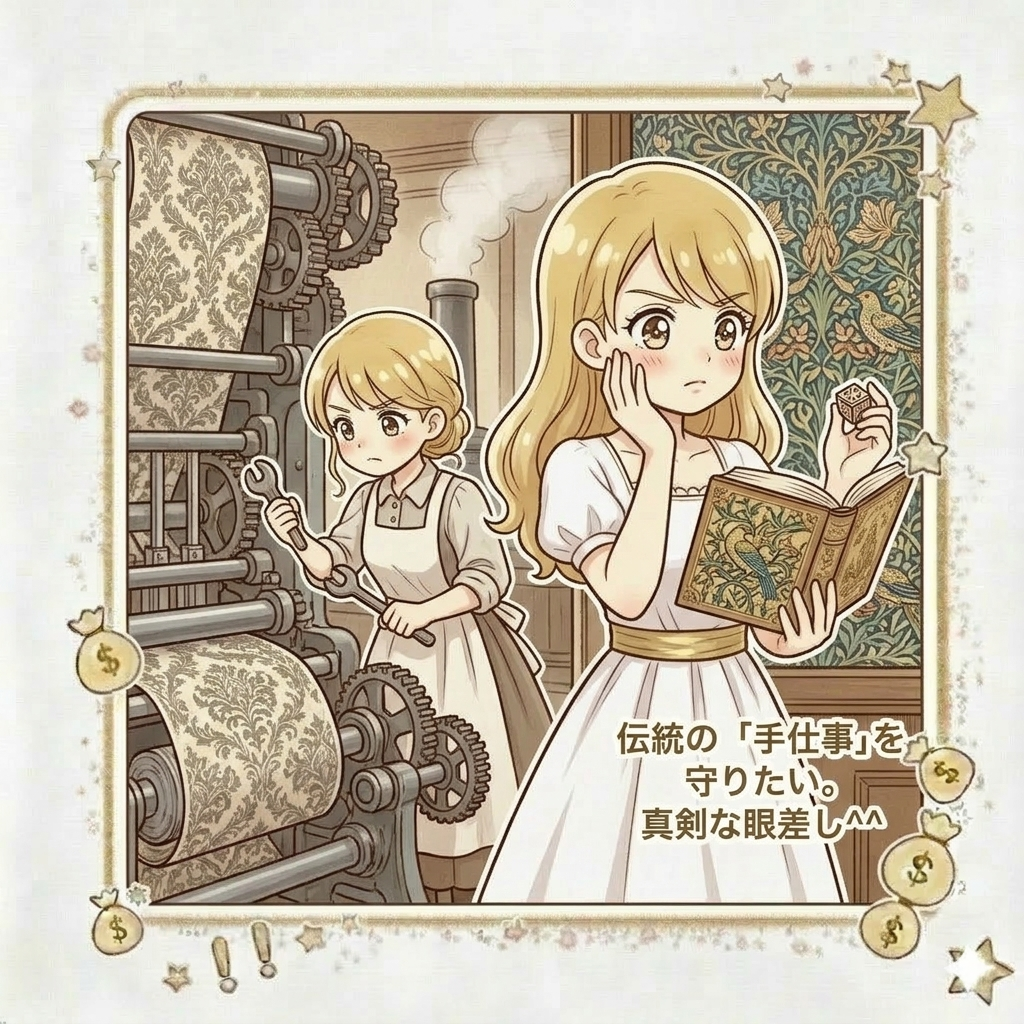 ここで立ち上がったのが、近代デザインの父、ウィリアム・モリスです。「機械に負けない職人の手仕事」を復活させ、今のデザイン壁紙の基礎を築きました。