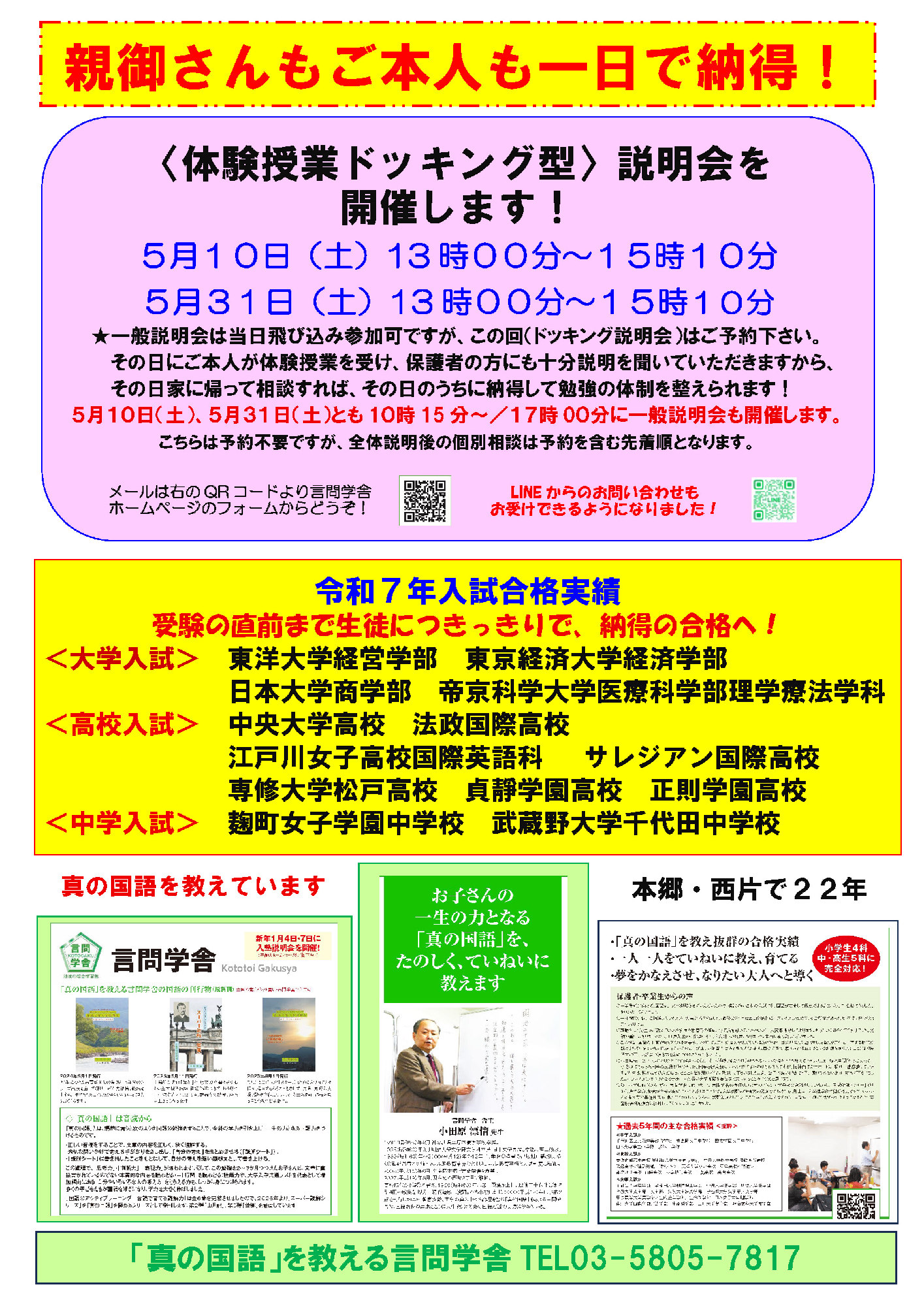 また、先だってから、「ゴールデンウィーク明けは学校が忙しくなりますよ」とお伝えしつづけた来た流れもあります。そこで、ご本人の「体験授業(無料)」と保護者の方の「個別相談」を同じ日に一度に済ませることができる「体験授業ドッキング型入塾説明会」を開催することと致しました(既報)。日程は以下の通りです。