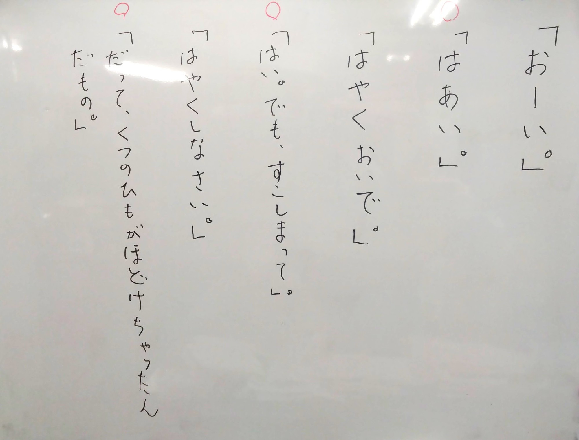 ホワイトボードにこの会話文を書いている時から興味深そうにボードを見つめていた生徒は、私の音読につづけて、この文を読み上げます。最後の「だって、・・・」の一文は、低い声で、ちょっとこまったように・・・。