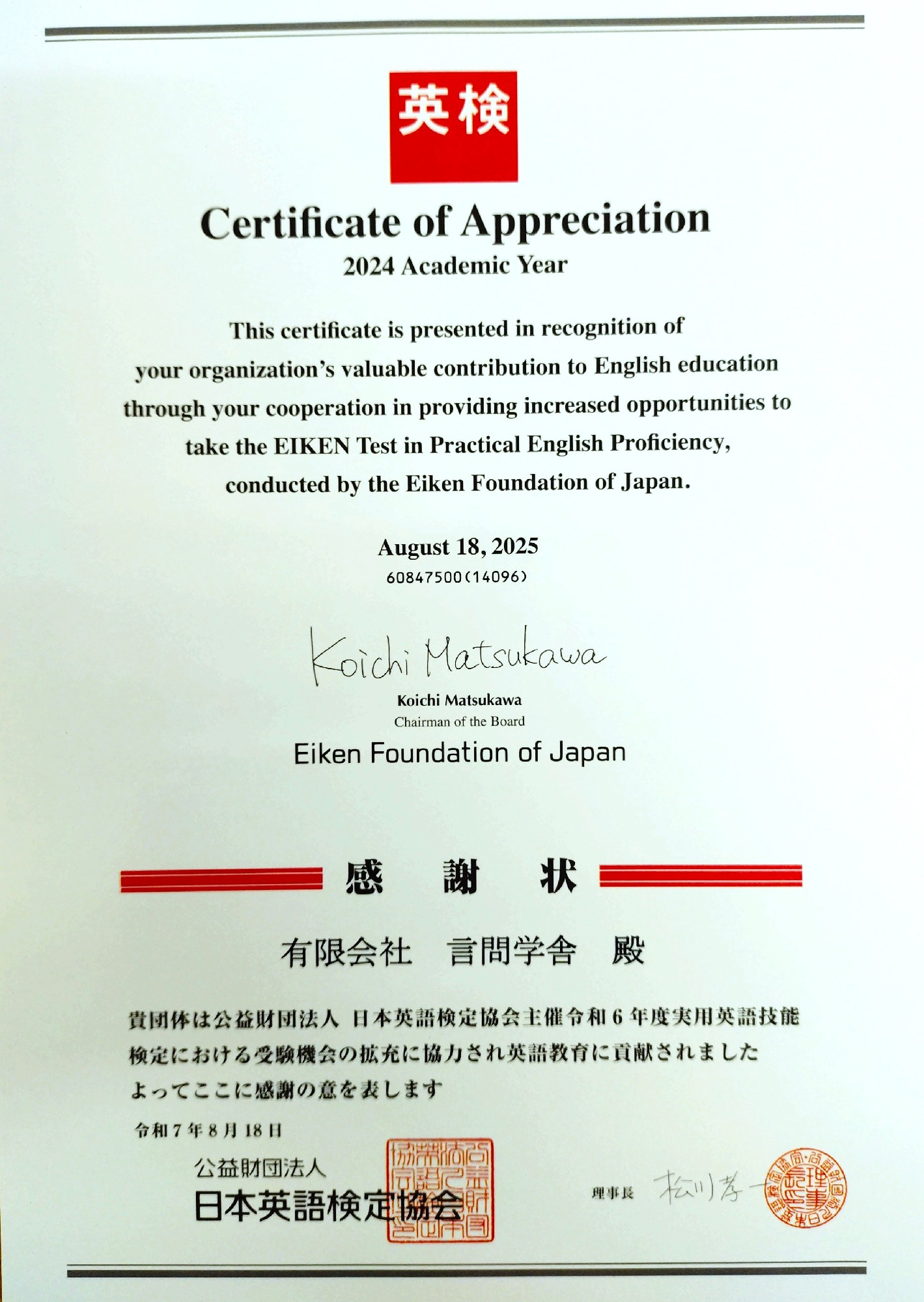 このほど、公益財団法人 日本英語検定協会様から、令和6年度の一般受験者受け入れ等に関連する受験機会の拡充、英語教育への貢献を評価していただき、感謝状を頂戴しました。