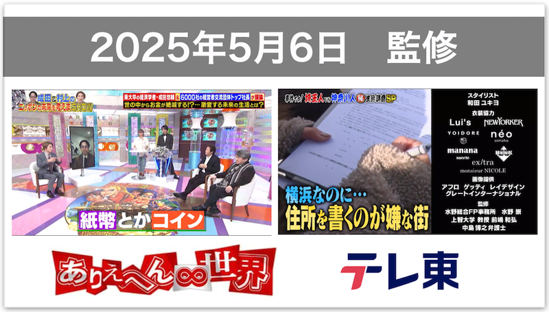 「テレビ東京」系列で2025年5月6日(火)に放送された『ありえへん∞世界』の番組コーナー「成田&村上のニッポンの未来を考えまSHOW」を、水野総合FP事務所代表・水野崇が監修しました。