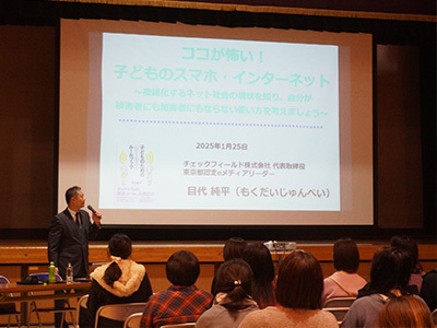 当日は保護者と先生方を対象に、「ココが怖い!子どものスマホ・インターネット」というタイトルでお話しさせていただきました。
