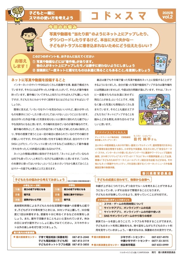 2025年12月、香川県教育委員会が発行しているコラム「コド×スマ 2025年 vol.2」に、記事を執筆しました。「子どもと一緒にスマホの使い方を考えよう」をテーマに、保護者の方々から寄せられたお悩みにお答えした内容になっております。今回は「写真や動画の著作権」についてお伝えします。