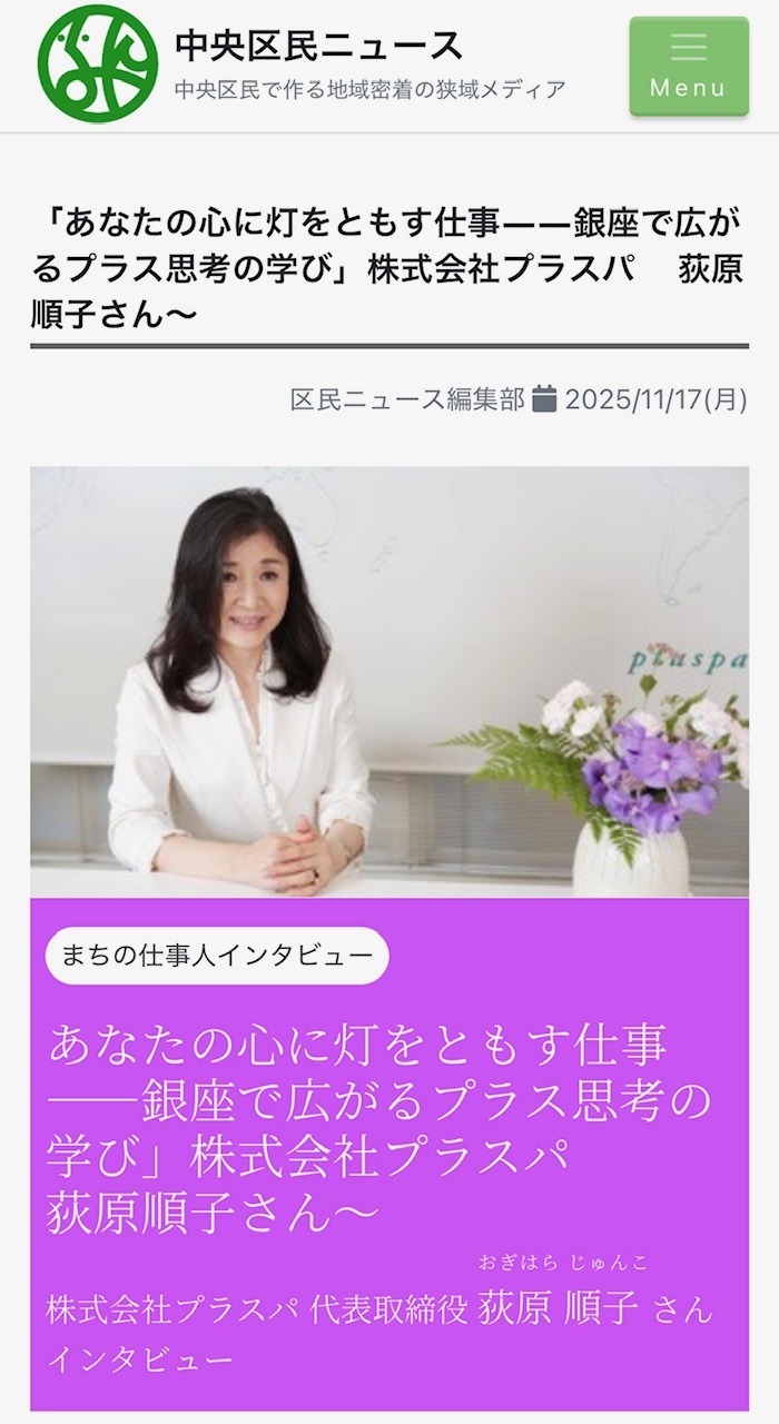 『中央区民ニュース』の地元の経営者3名インタビューに荻原代表が選出され、インタビューが掲載されました。