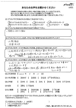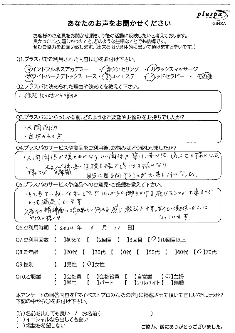 人間関係、自身の生き方に悩んでいた所、信頼できる方から勧めて頂き、プラスパに決めました。サービス利用後は、人間関係が穏やかになり、良い関係が築け、安心して過ごせるようになりました。また様々な不安を解消し将来の目標を持って過ごせるようになり、自分に目を向けることができるようになりました。とても丁寧なサービスで心からの働きかけを感じる事ができるので、とても満足しています。プラスパの想いや香りの精神面への効果というものを感じ教えられます。生きていく勉強、糧になっています。