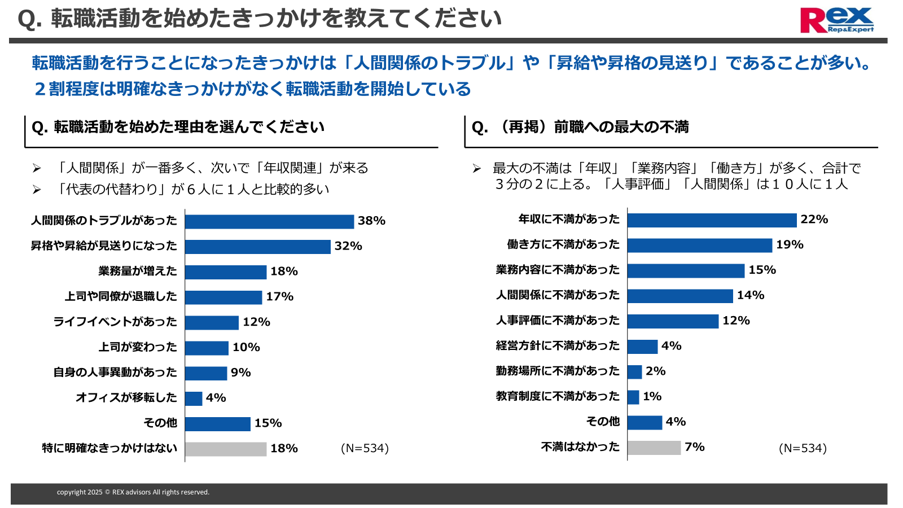 経理人材や会計人材に特化した転職サポートを行う株式会社レックスアドバイザーズが、2023年から2026年に経理職に転職した534名を対象に行った、「経理職の転職実態に関する調査」(株式会社PRISMAのアンケートパネルを活用)にて、転職のきっかけを聞いたところ、以下の結果となりました。