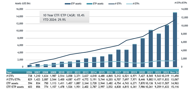 17年余が経過した2024年11月末時点では「ETF本数11,490本、資産規模14兆9630億ドル」となり、