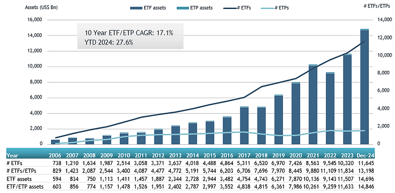 17年余が経過した2024年12月末時点では「ETF本数11,645本、資産規模14兆6960億ドル」となり、