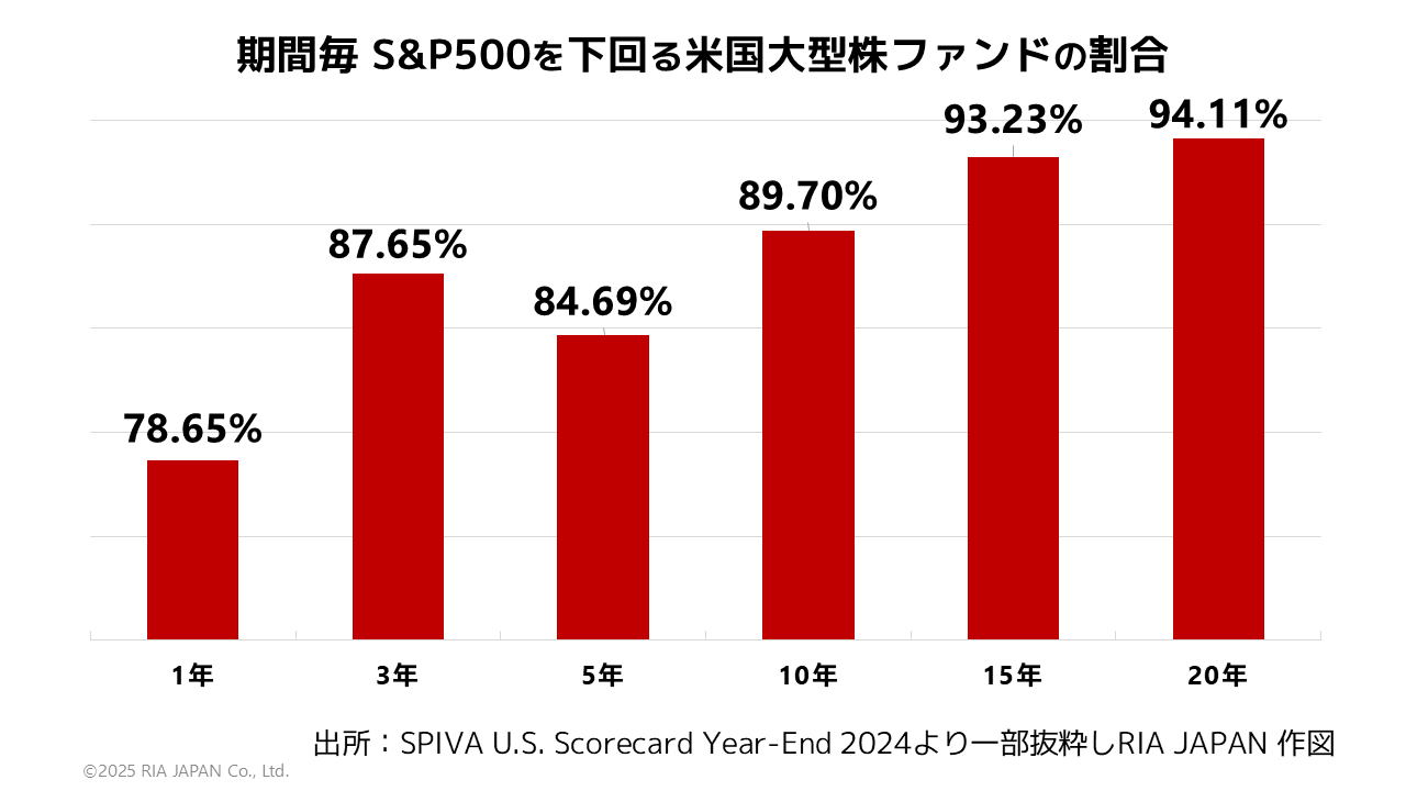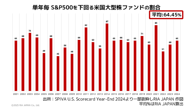 2024年の1年間、米国大型株式ファンドは65.24%の割合でS&P500指数を下回りました。