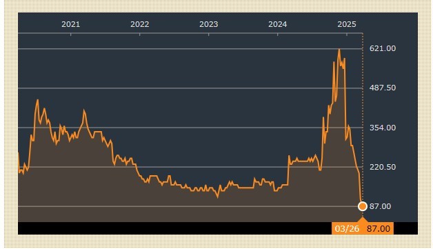 2025/03/24の株価は84円、▼87.4%の下落です。