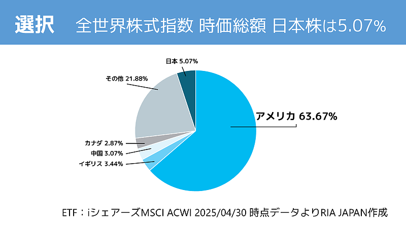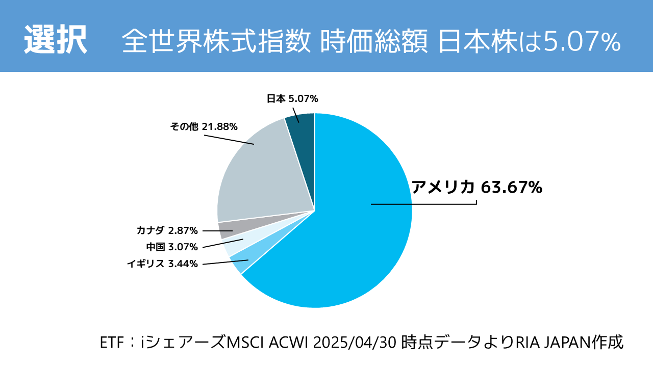 MSCI ACWIでは、時価総額で日本株が占める割合は約5.07%しかありません。