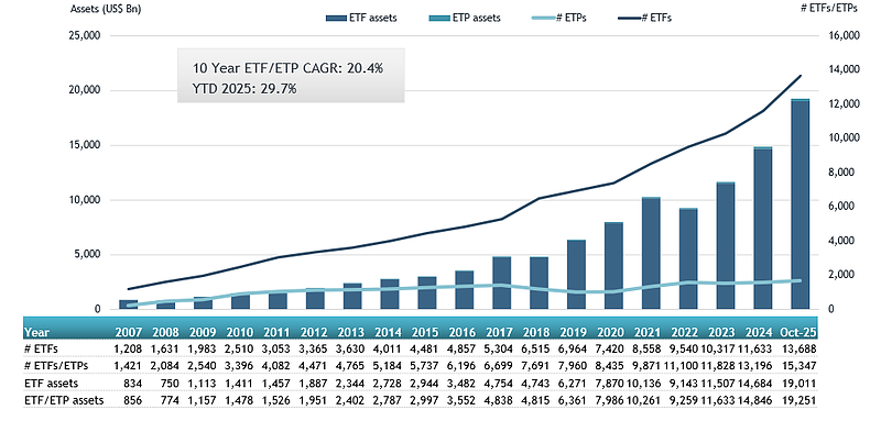 18年余が経過した2025年10月末時点では「ETF本数13,688本、資産規模19兆110億ドル」となり、
