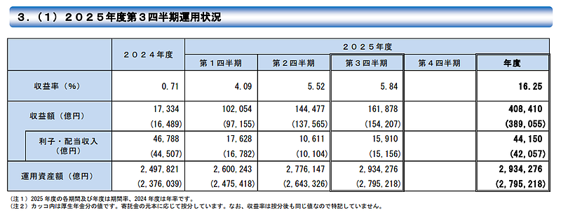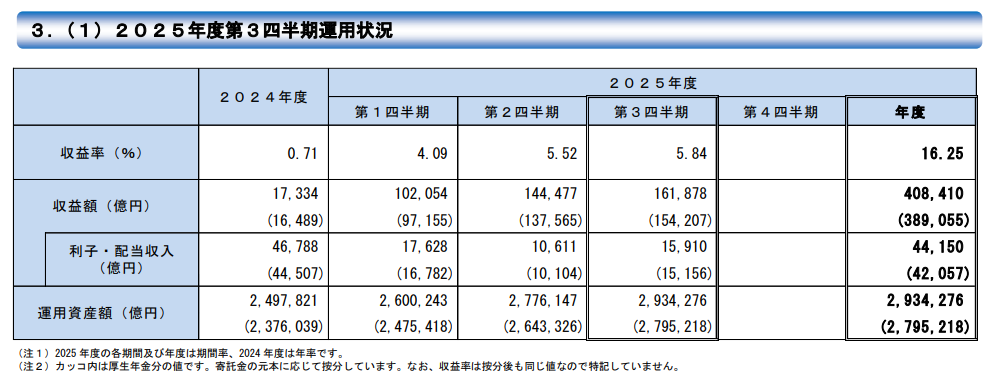 第1Qは4.09%、第2Qは5.52%、2025年度の3期通算(4月∼12月)では16.25%、40兆8,410億円の収益となっています。