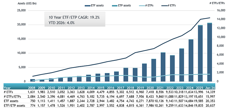 19年余経過した2026年1月末時点では「ETF本数14,339本、資産規模20兆3,500億ドル」となり、