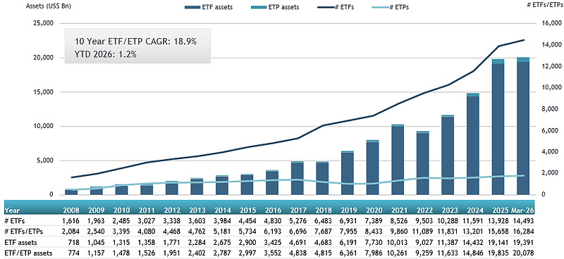 19年余経過した2026年3月末時点では「ETF商品数14,493本、資産規模19兆3910億ドル」となり、