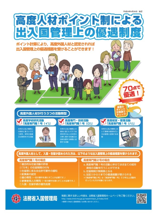 「高度専門職」は専門スキルが高いと認められた方が、日本でより活動しやすくなるための特別な在留資格です。日本の経済成長のためにも、優秀な外国人の方にはどんどん来て頂きたいですね。