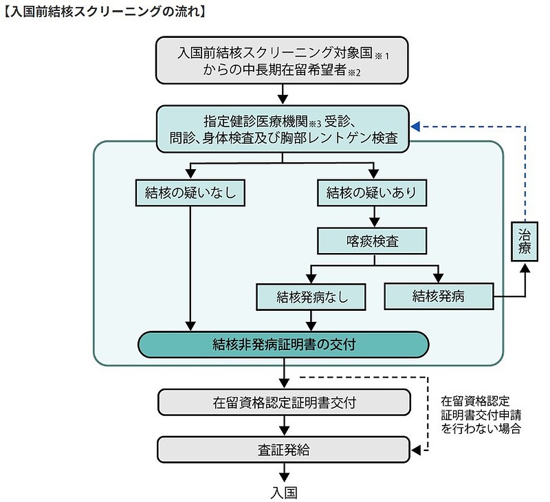 ※入国前に受けた健康診断に結核検査を目的とした胸部レントゲンが課せられていた場合も対象外です。