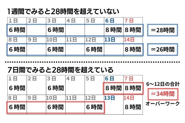週28時間と聞くと、月曜から日曜または日曜から土曜をイメージされるかと思いますが、週28時間とは連続した7日間のことを指しますので下の図を参考に注意しましょう。