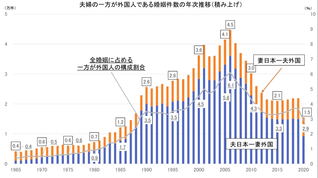 日本の国際結婚は3.5%程度とされていますので、韓国の1割は多いですね。