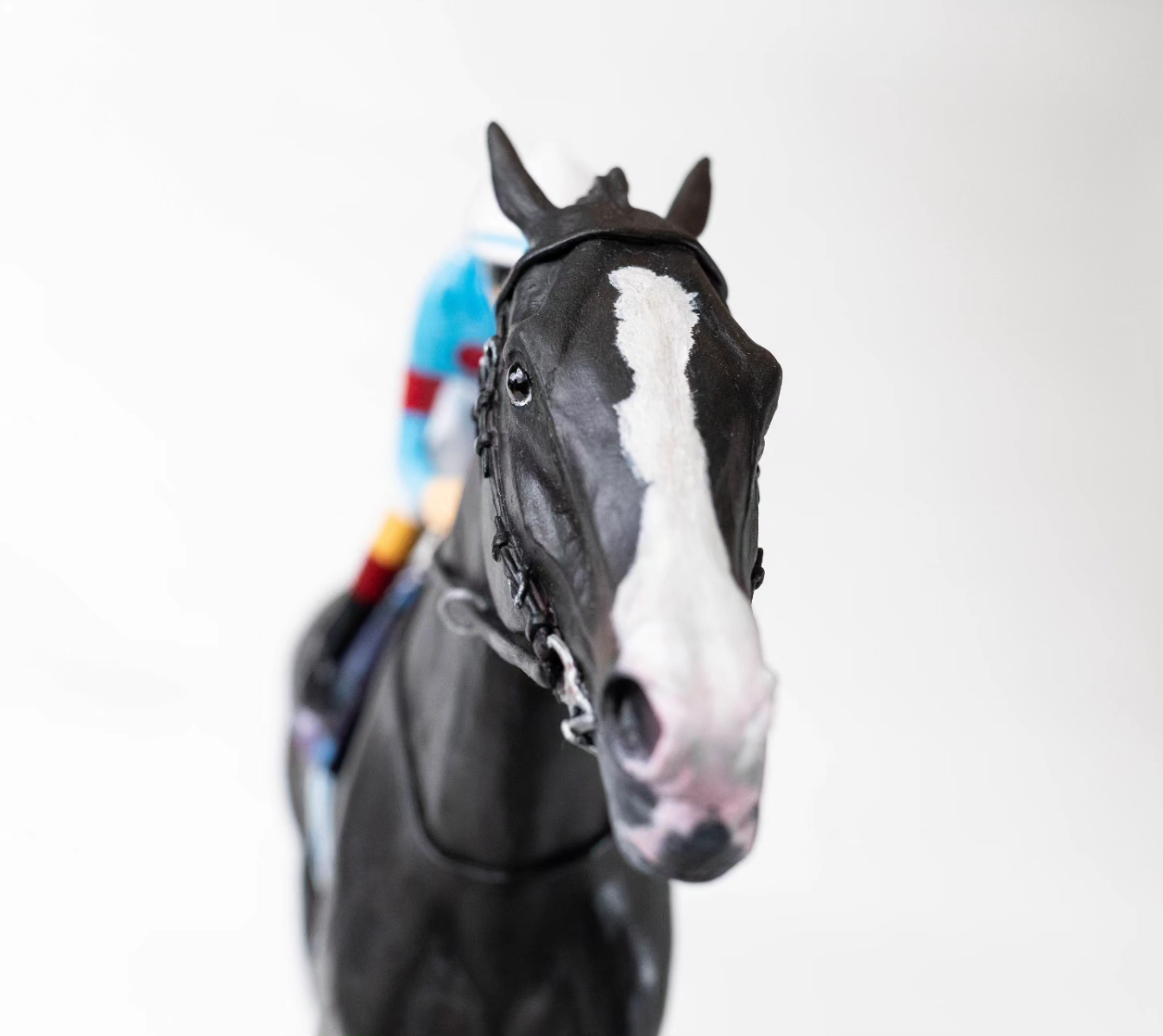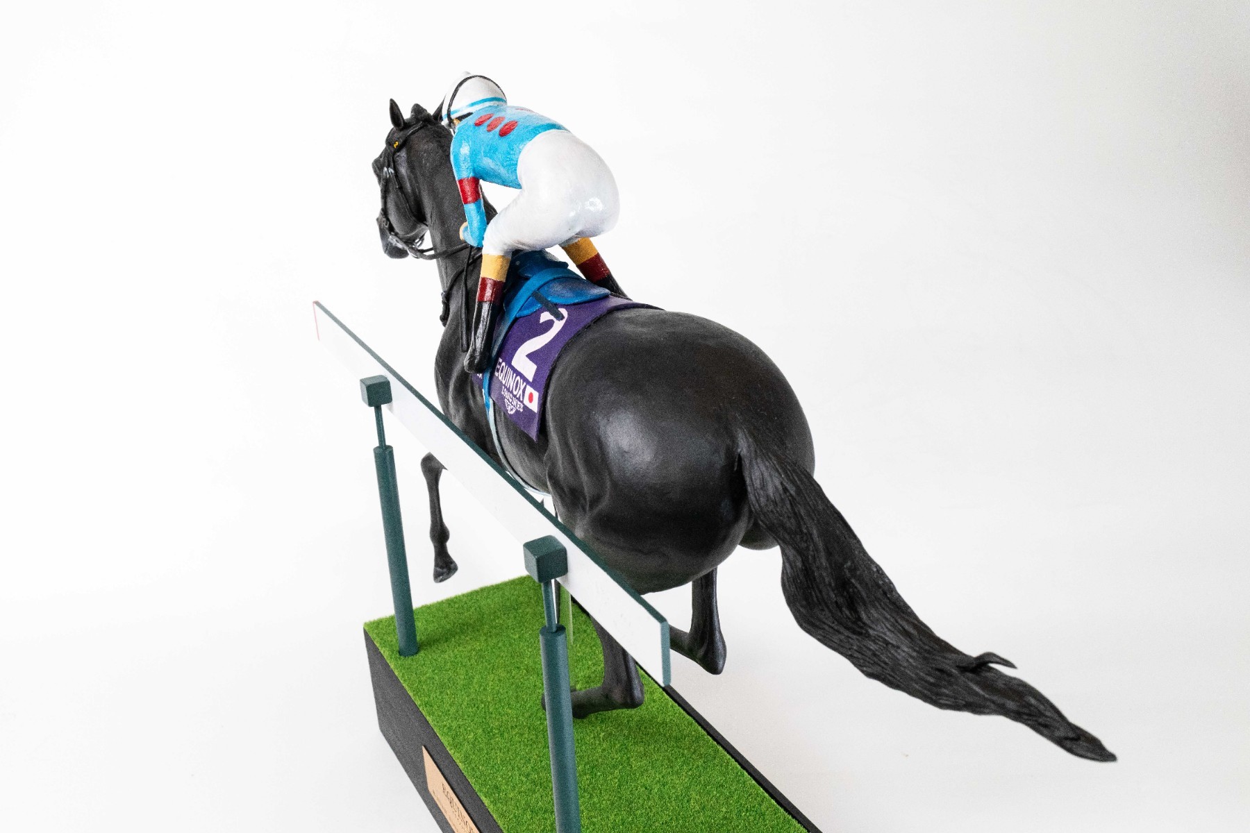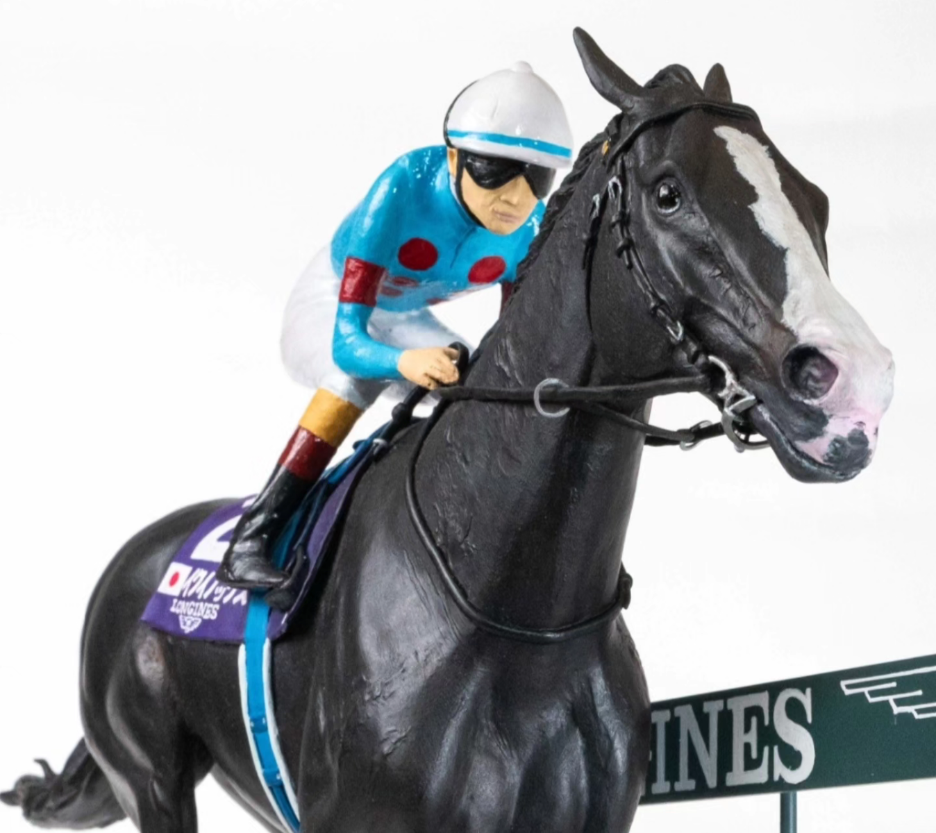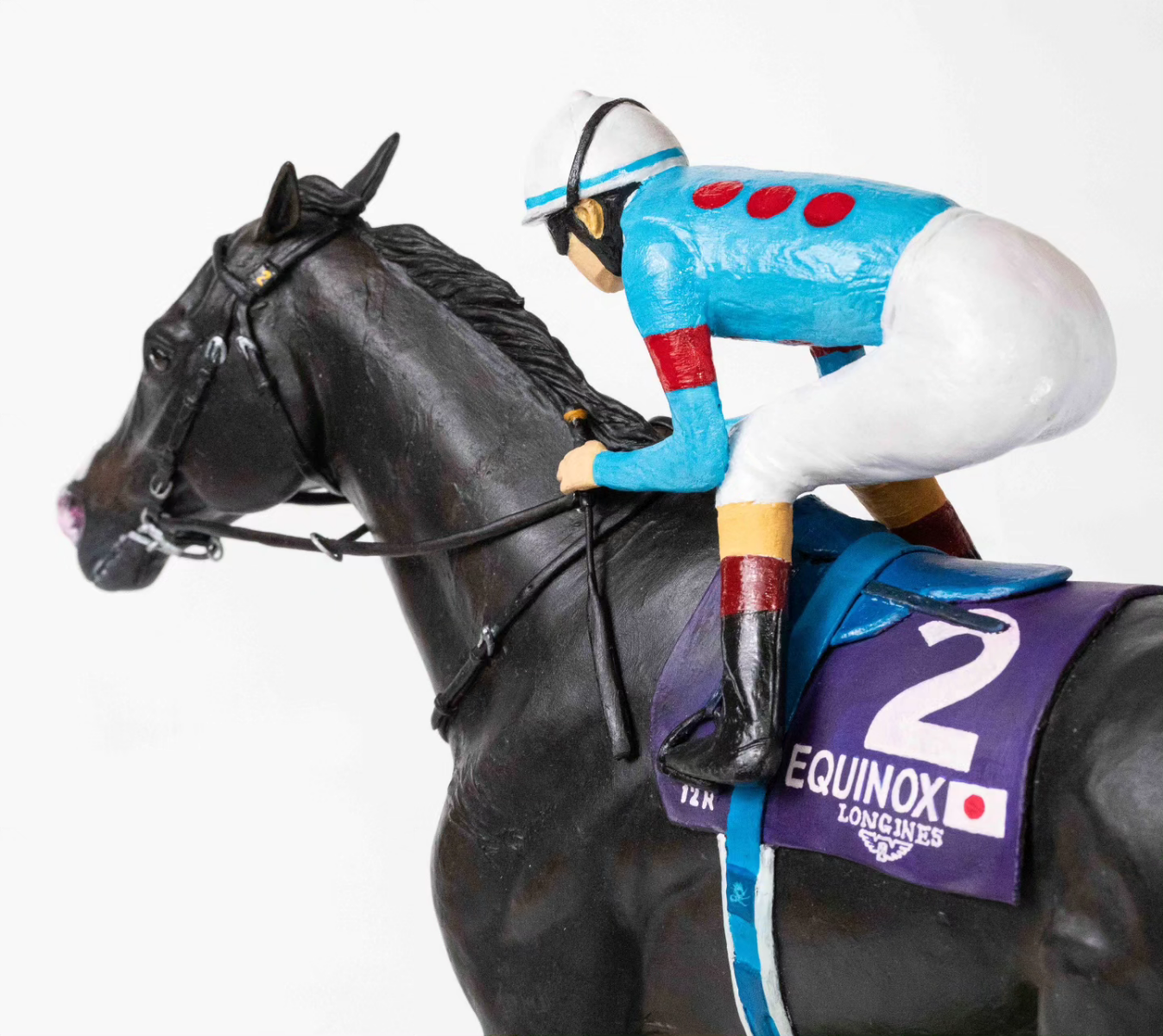 イクイノックスが好きな方より、ジャパンC優勝時のゴール前をフィギュアにしたいとオーダーをいただきました。 イクイノックスが持つ闘争心と繊細な部分が伝わるように制作いたしました。こだわりポイントは浮き出た血管と特徴的な右目です。