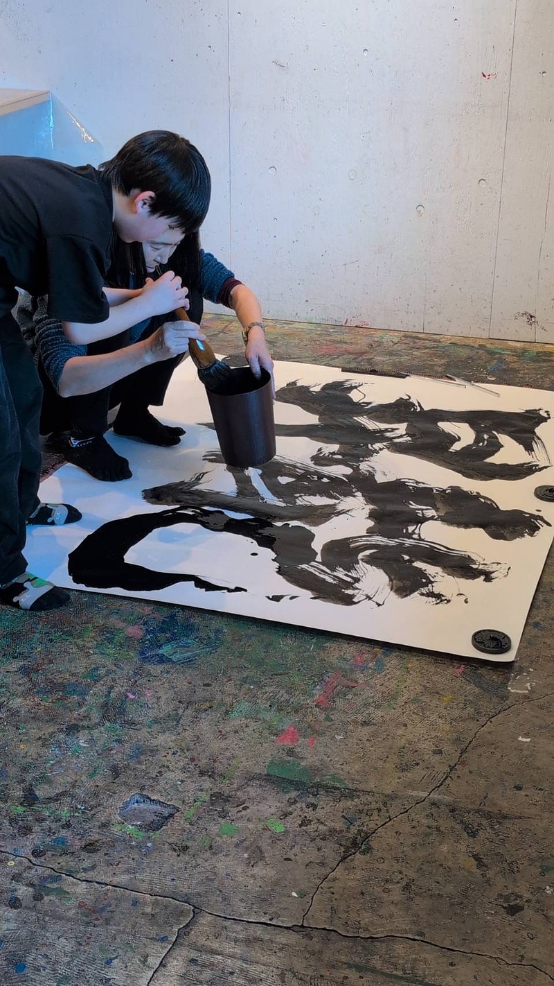 120センチ×90センチの大きな紙に、直径5センチくらいの大きな筆で、身体全体を使って書きます。