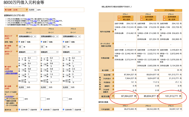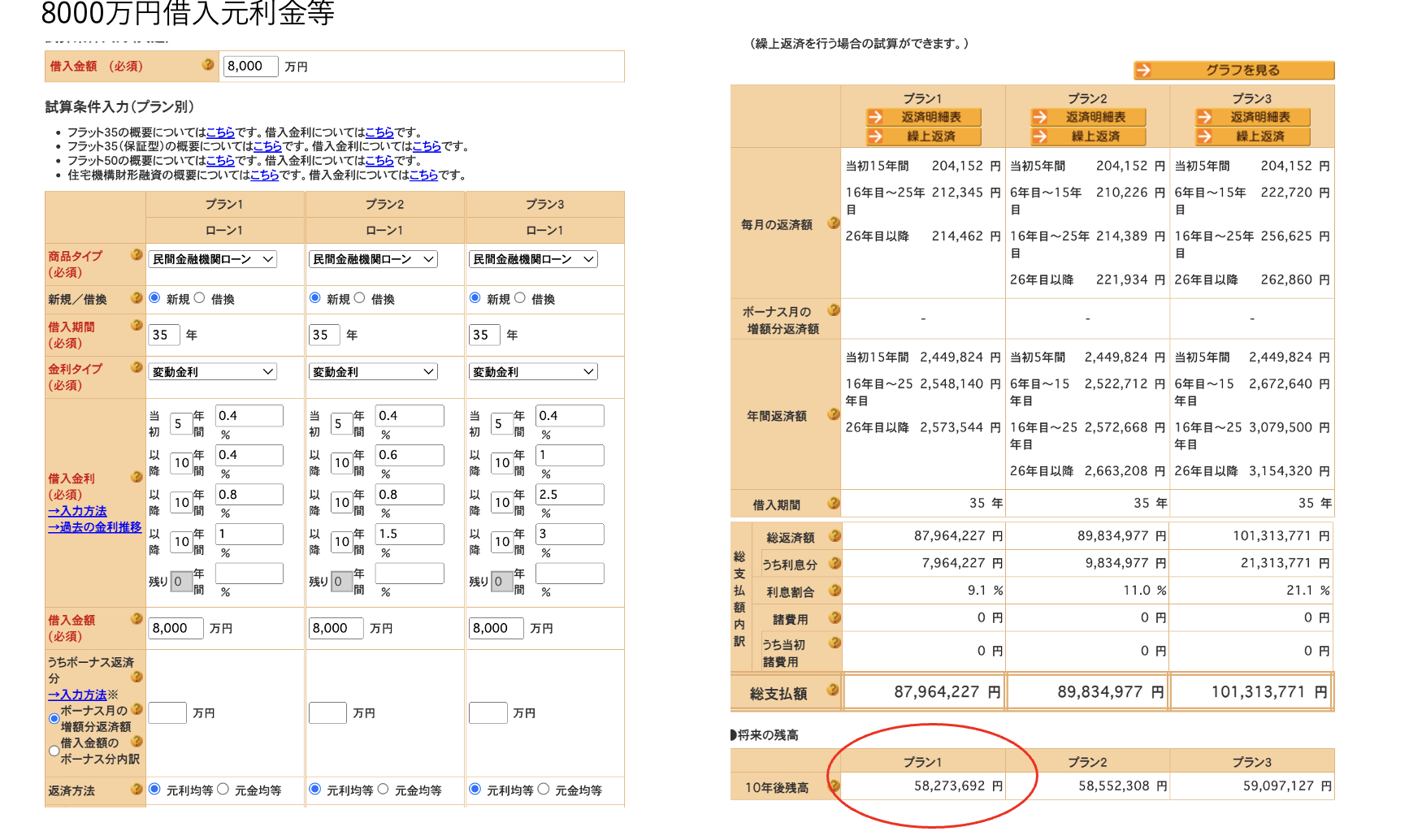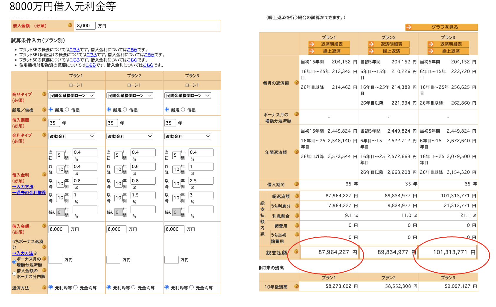 この数字をみると、借入金額の多い初期に金利が安い方がやっぱり総支払額が安いということがわかります。じゃあ5年後に2%、15年後に3%になったらとシュミレーションをしてみれば35年固定金利のほうが安くなるはずです、しかし、そうなると8000万円を借りる気もなくなるかもしれませんね。