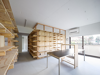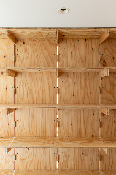 間仕切壁を本棚として,15mmの棚支持材を挟み込んで,隙間を空けて空間全体に光を通しながらゆるやかに仕切っています.