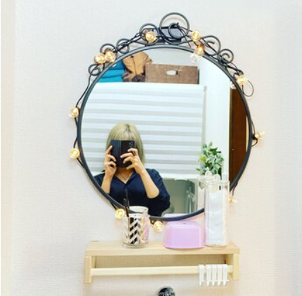 予算を抑えながらも機能的な空間にするため、IKEAの基本ミラーを女優ミラーにDIYしました。LED照明を追加することで、自然光に近い明るさでメイクや肌の状態をチェックできるようになっています。また、小物置き場としてIKEAのスパイスラックを活用し、ひっくり返して設置することで奥行きのある収納スペースを実現しました。