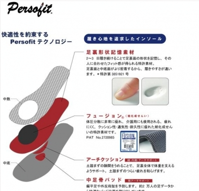 2~3日履き続けることによって、足裏表面の形状を記憶し、その人に合わせたフィット感が得られる特許素材です。足裏面と中底面がより密着するから、履きやすさが違います。※特許第38511921号