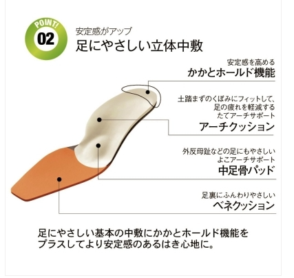 オリジナル中敷き+ホールド機能で、長時間でも疲れにくい。