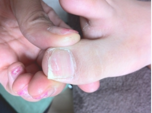 巻き爪+強打で爪が欠け、スパンゲも剥がれに