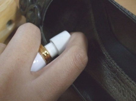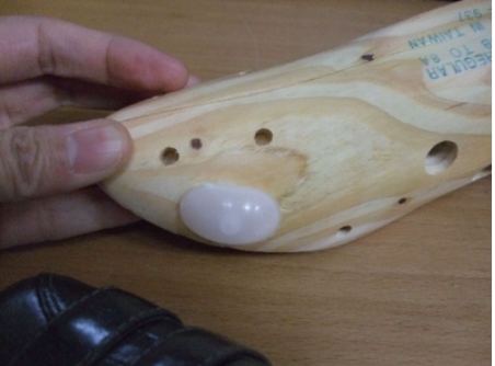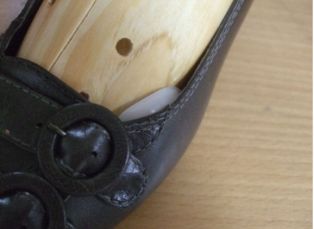 痛みのある箇所に塗布してから、女性用のシューストレッチャー(靴を広げる器具)を使ってセットします。