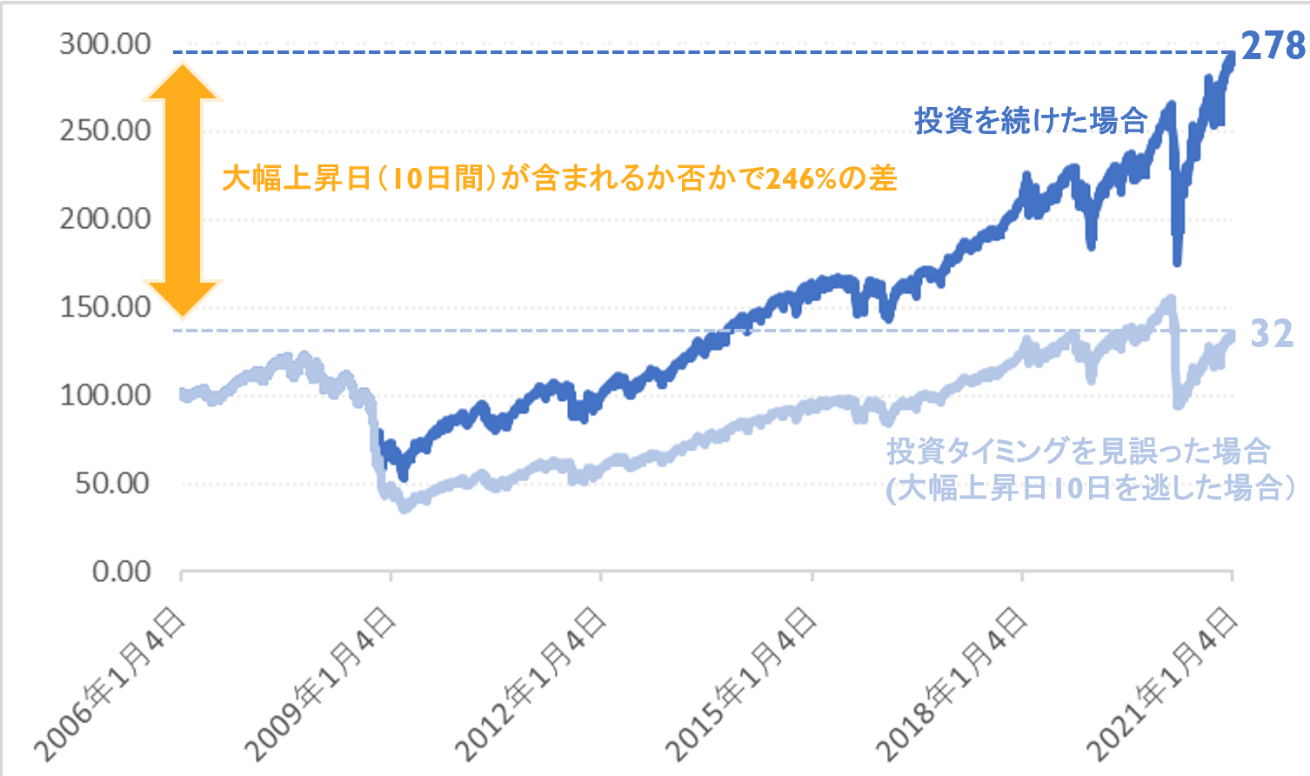 2006年1月から代表的資産の一つである米国株式に投資した場合、保有し続けると2021年1月現在資産は約2.8倍に成長しました。その一方で、投資タイミングを見誤って市場が大幅に上昇する前にいったん投資を終え、その後に再開するといった行動をとった場合、たった10日間の大幅上昇日を逃しただけで約32%の上昇と大きな差が出ました。