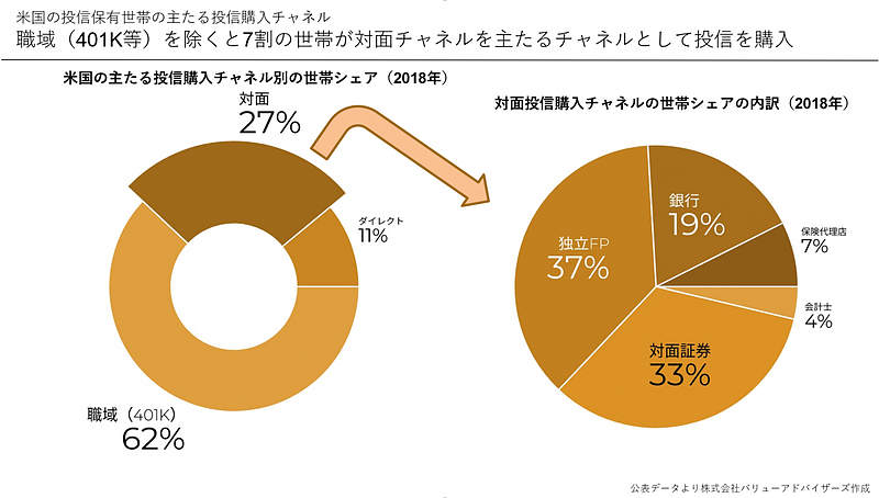 企業年金である401Kを除くと7割の方が投資信託を対面チャネルから購入しています。