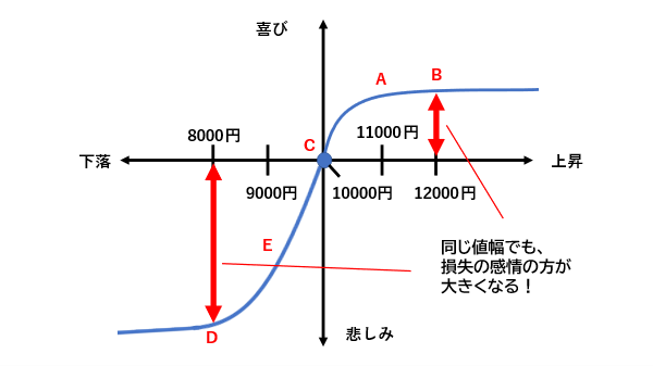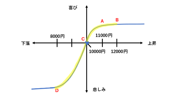 続いて1万2000円から1万円に下がるとした場合、Cのように喜びが減ります。さらに8000円まで下落するとDのように悲しみが大きくなります。