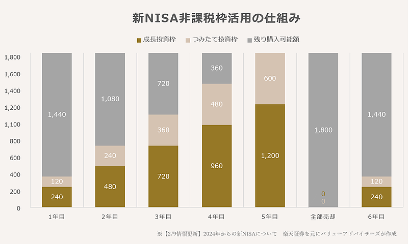 例えば、図2のように5年間で毎年、成長投資枠240万円とつみたて投資枠120万円で投資し1800万円の生涯投資枠を使い切ったとします。5年目で1800万円分の商品をすべて売却した場合、翌年以降に1800万円の投資枠が再度利用可能です。