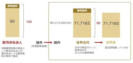 例えば、米国株式の配当金は、まず米国にて10%の税金が差し引かれた後、残りの90%部分に対して日本にて20.315%が課税されます。したがって、配当金が100とすると、源泉徴収後の手残りの金額は、下記の通り「約71.7」となります。