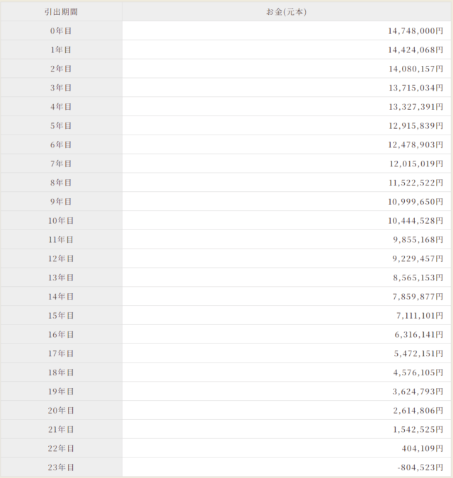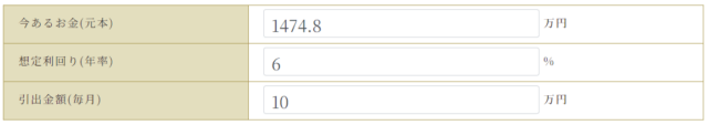1474.8万円が全てなくなるまで22年以上という結果になっており、70歳+22歳で92歳まで毎月10万円を取り崩すことができる計算になります。