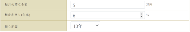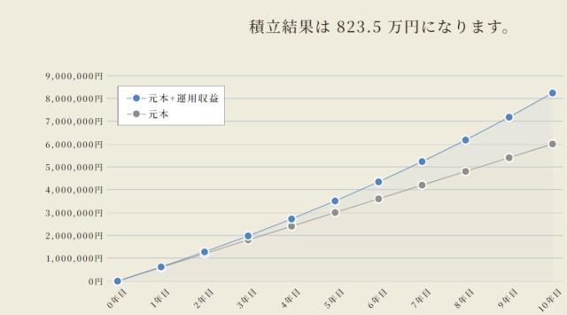 図は50歳から60歳までの10年間で毎月5万円づつ積立投資を行った場合のシミュレーションです。