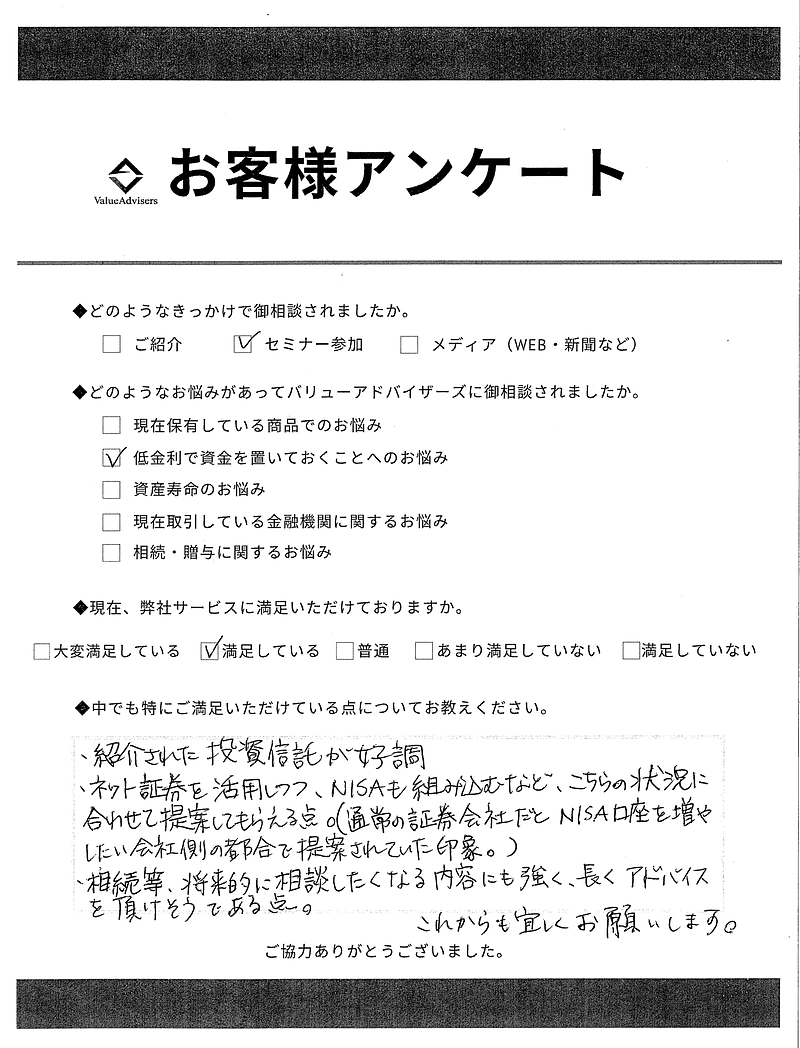 紹介された投資信託が好調·ネット証券を活用しつつ、NISAも組み込むなど、こちらの状況に合わせて提案してもらえる点。合わせて提案してもらえる点。(通常の証券会社だとNISA口座を増やしたい会社側の都合で提案されていた印象。)相続等、将来的に相談したくなる内容にも強く、長くアドバイスを頂けそうである点。これからも宜しくお願いします。