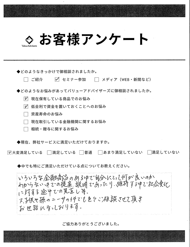 いろいろな金融商品のある中で自分にとって何が良いのかわからない中での提案、説明であったり、維持する中で社会変化に対する途中での見直し等。又、子供や孫のニーサの件でも色々ご相談させて頂きお世話になっております。