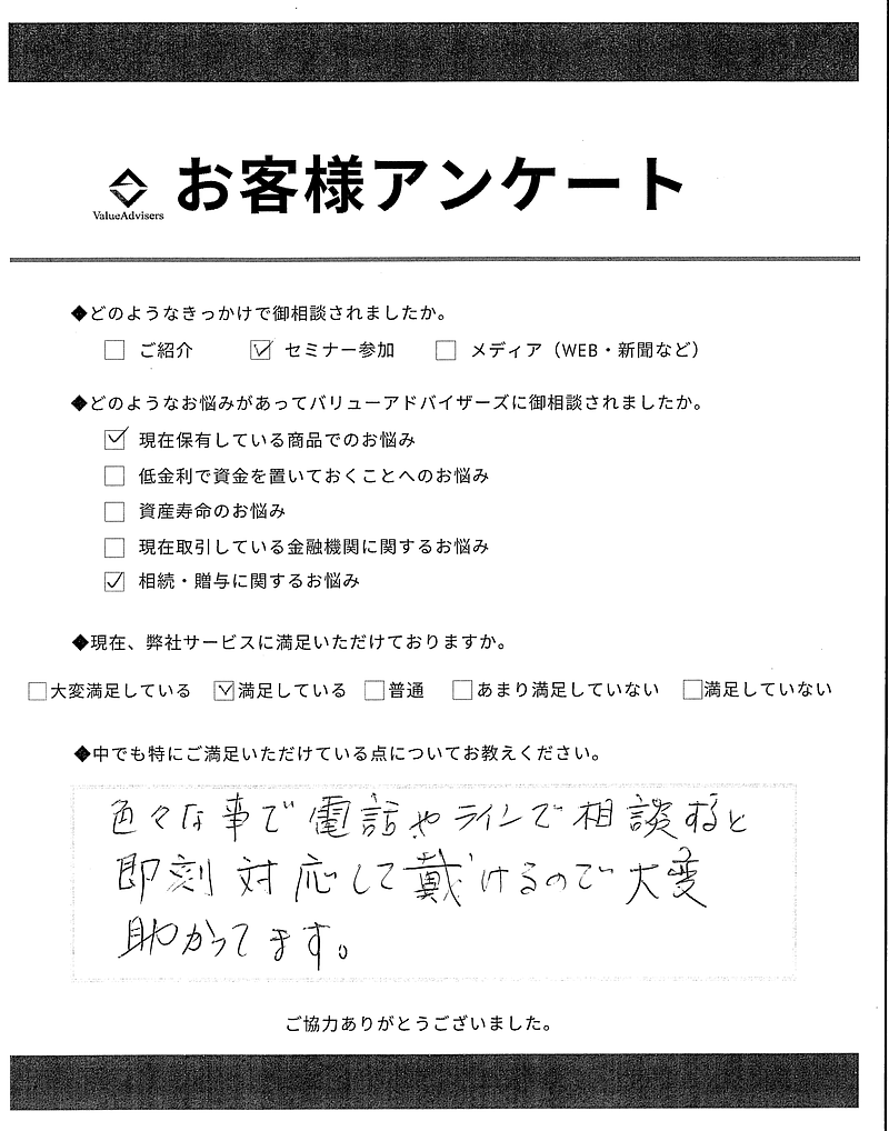 色々な事で電話やラインで相談すると即刻対応していただけるので大変助かってます。