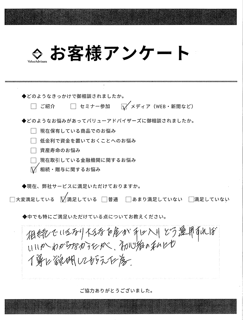 相続でいきなり大きなお金が手に入りどう運用すればいいかわからなかったが、初心者の私にも丁寧に説明してもらえた為。