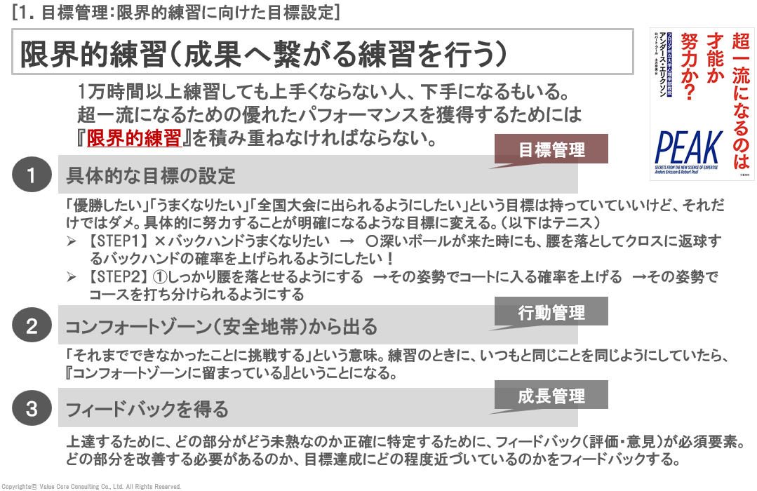 - 目標設定が適切であることで、大きな目標が達成できないときに、何が課題かわかること