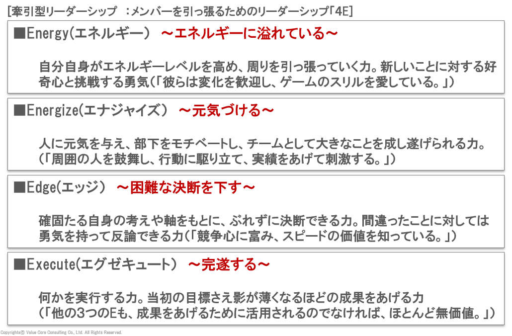 | Energize(エナジャイズ) | 周囲の人を鼓舞し、行動を促し、実績を上げてチームを刺激する。モチベーションの起点をつくる |