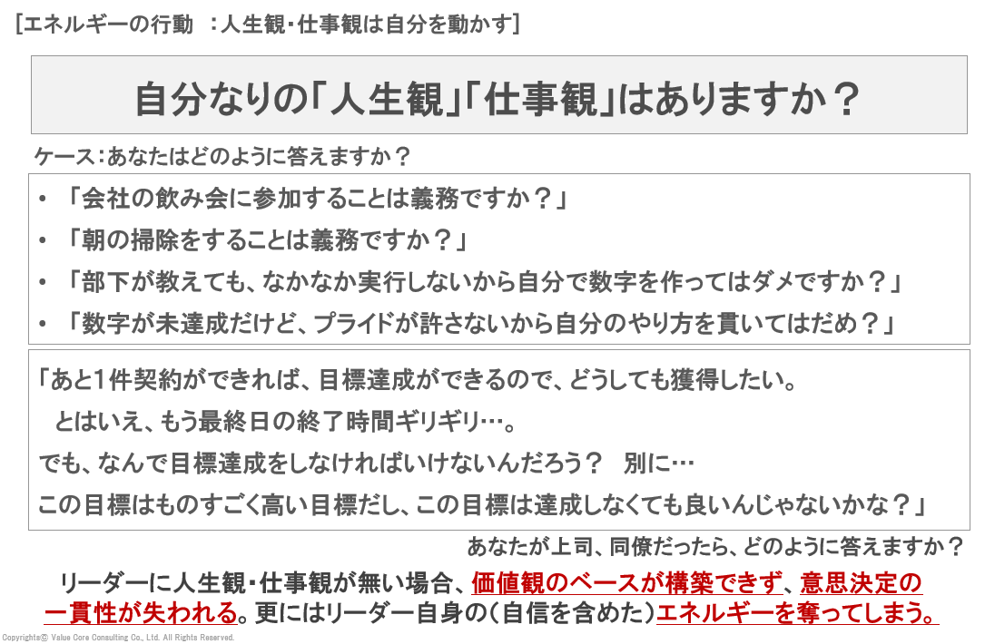一方で、明確な人生観・仕事観を持つリーダーは、判断に一貫性が生まれ、行動の動機が伝わり、組織の文化やチームの安心感を醸成します。