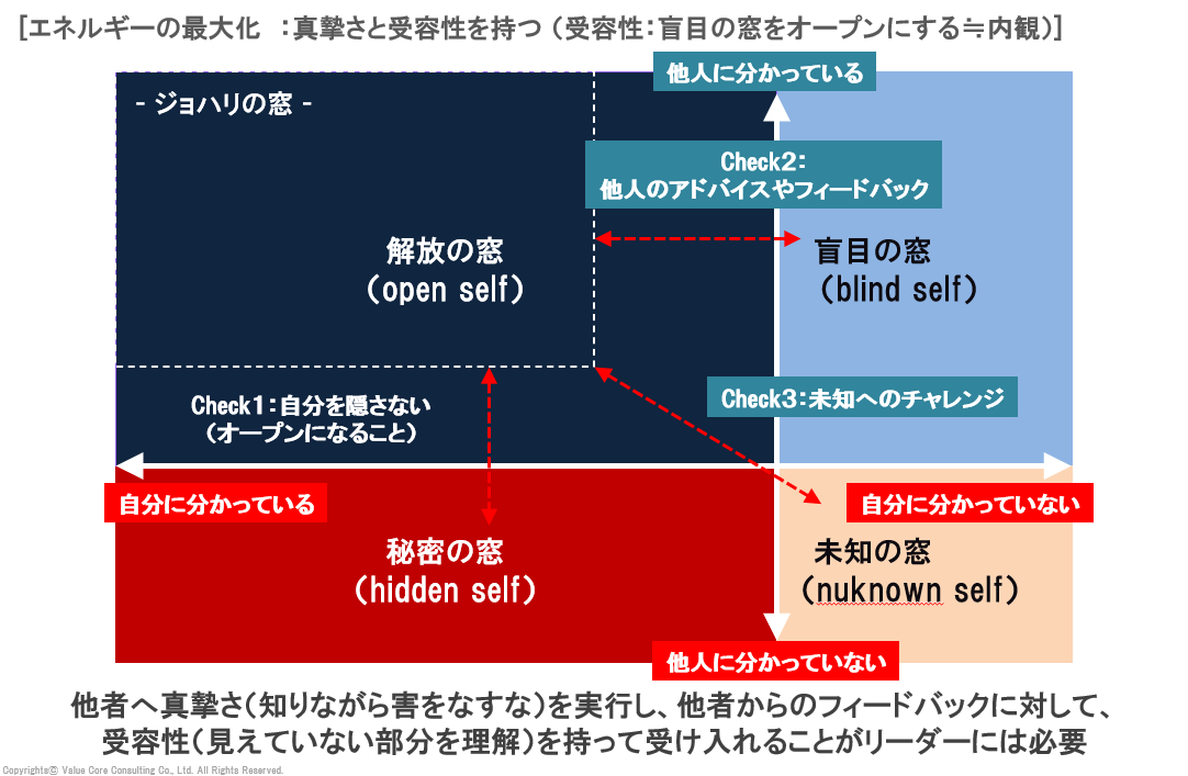 自らを開示し(Check1)、他者のフィードバックに耳を傾け(Check2)、未知へチャレンジする(Check3)ことで、エネルギーの最大化が可能になります。