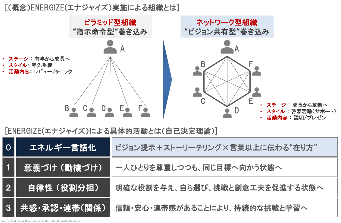 エナジャイズとは、「組織やメンバーの内発的なエネルギーを高め、前向きな行動と協働を促す」マネジメントの考え方です。