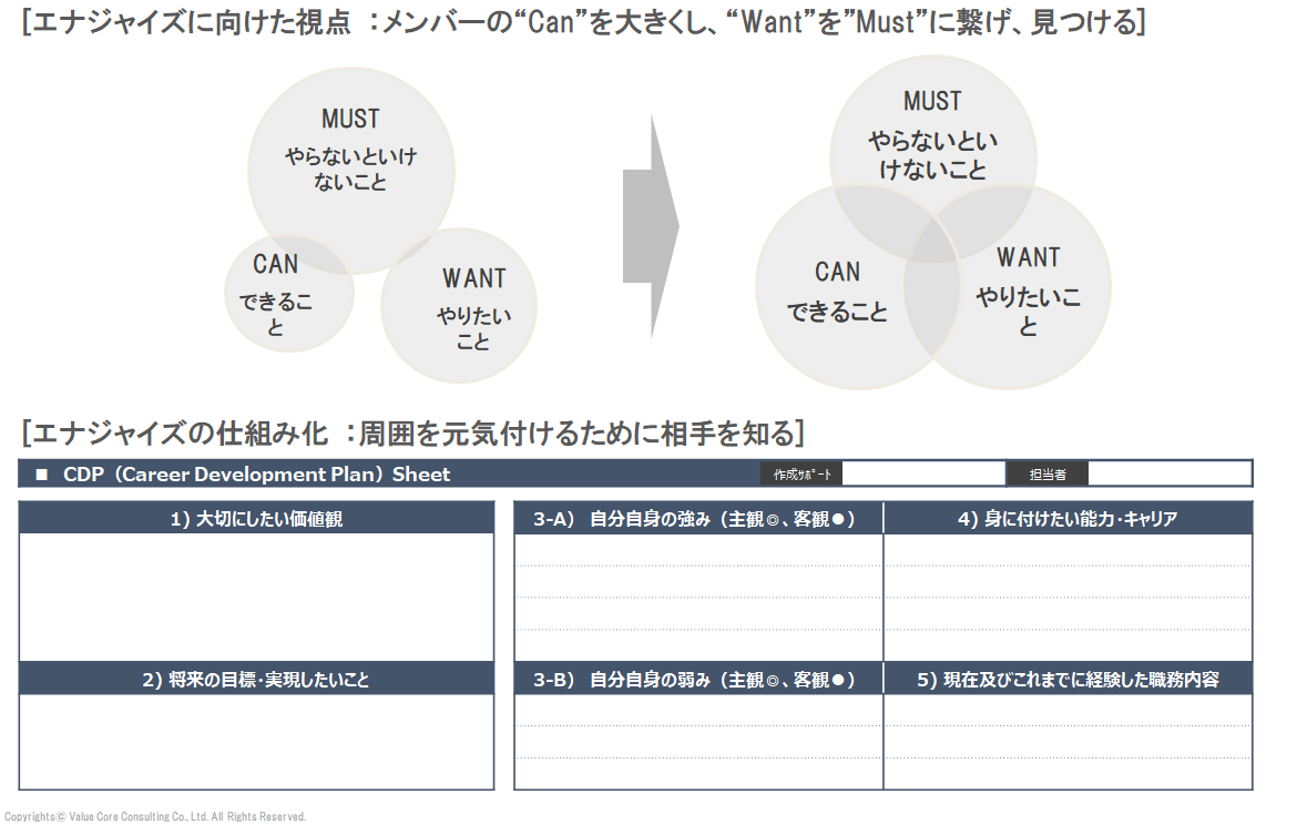 エナジャイズを実現するには、メンバーの「できること(Can)」「やりたいこと(Want)」「やらなければならないこと(Must)」