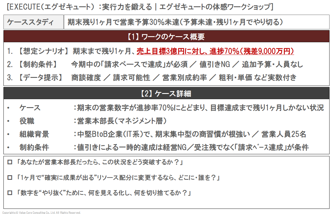 以下は、体感ワークショップのケース事例です。実務に即した意思決定力を磨くための、実行フェーズの問いと解法が整理されています。